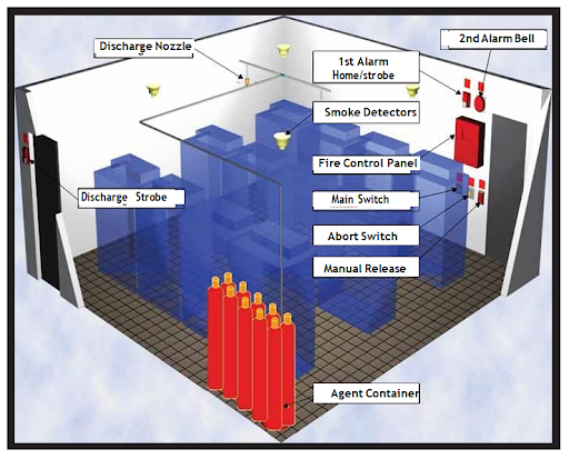 Oxygen: The oxygen level is reduced to 15 volume percent with the help of inert gases like argon and nitrogen. As soon as the oxygen level reduces more than 15%, fire no longer has enough agents to sustain, and hence most of the materials will cease to burn.